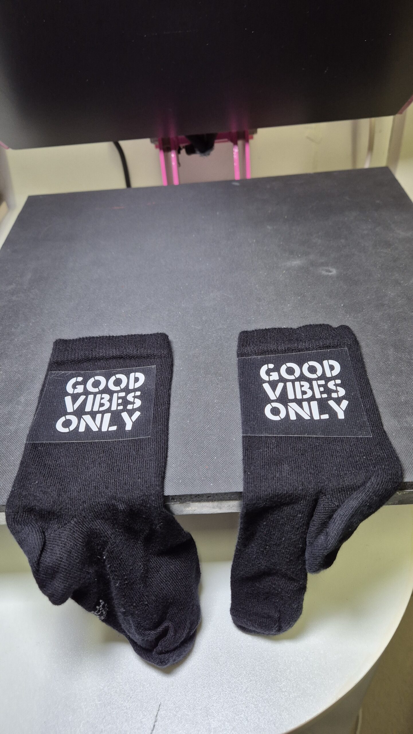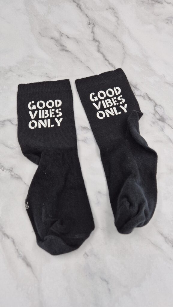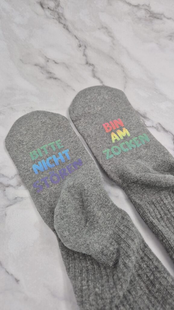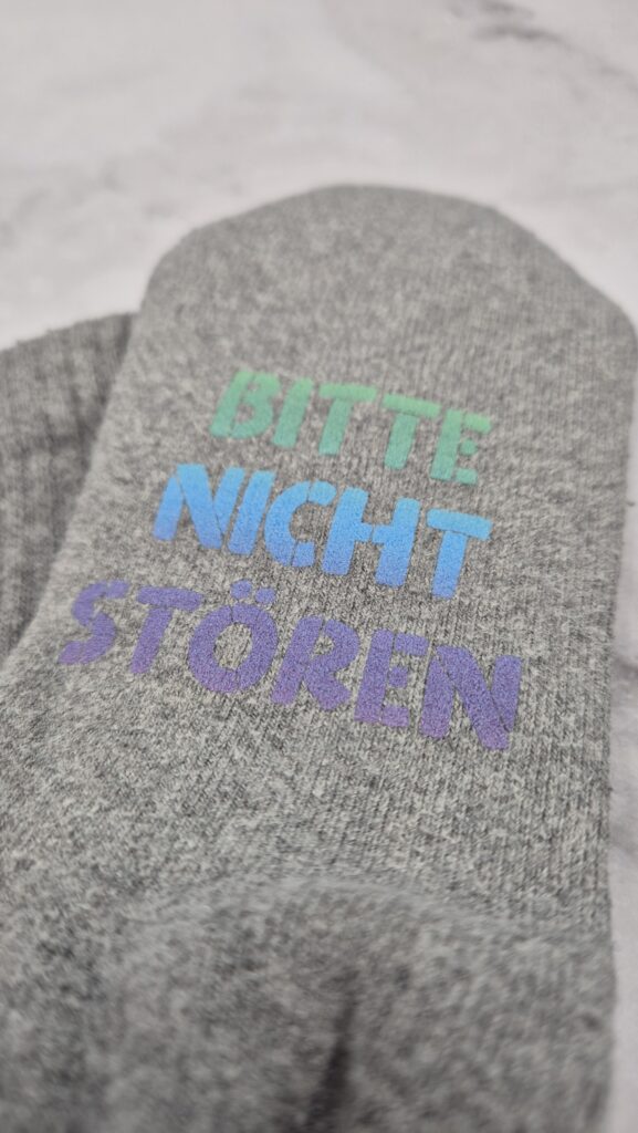 Diese beplotteten Socken verbinden Flexibilität und Kreativität: Das dehnbare Gewebe trägt eine klare Botschaft, die mit jedem Schritt hervor blitzt. Ein kleines Projekt das zeigt, wie vielseitig und spielerisch Textilgestaltung sein kann.