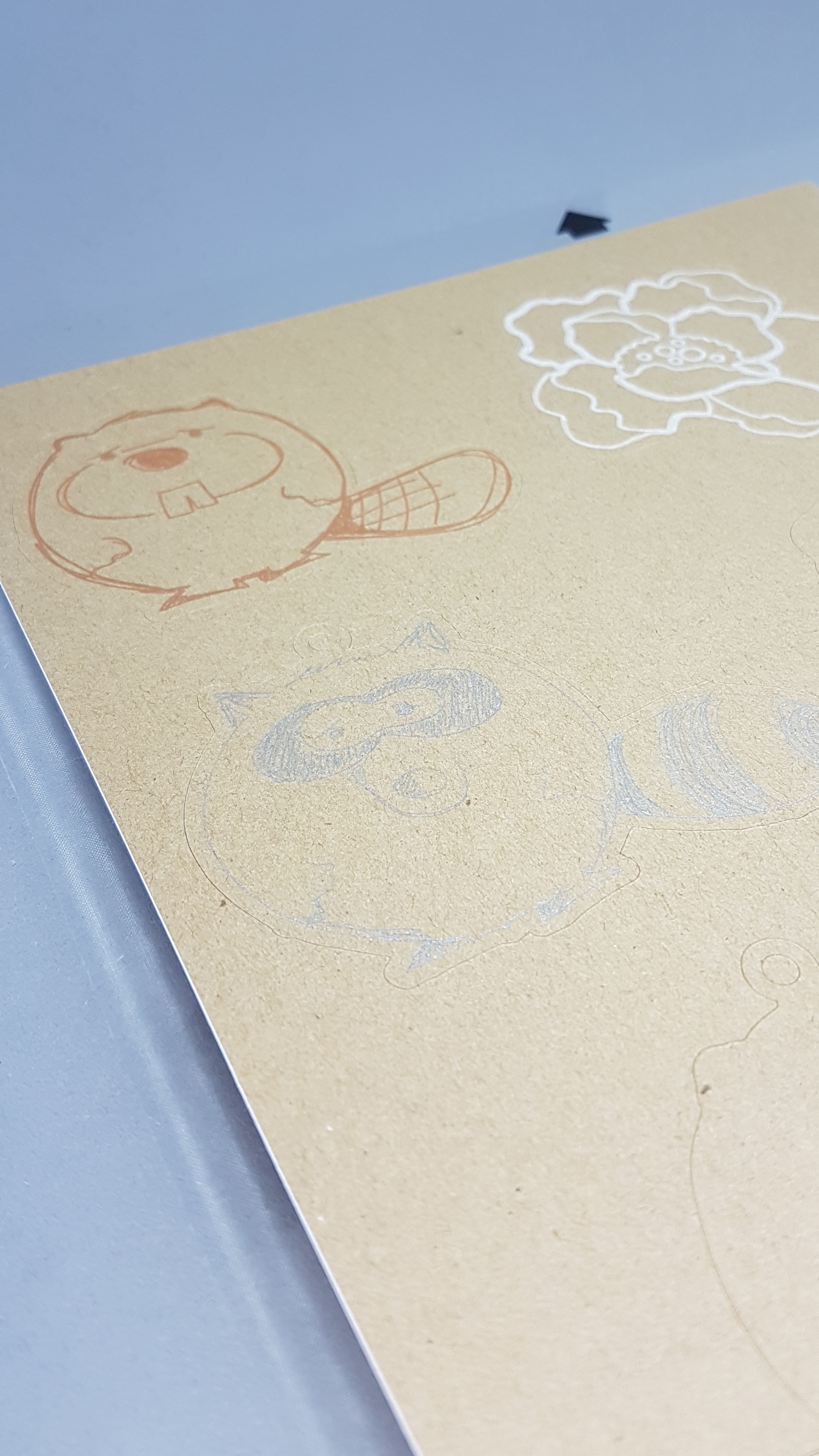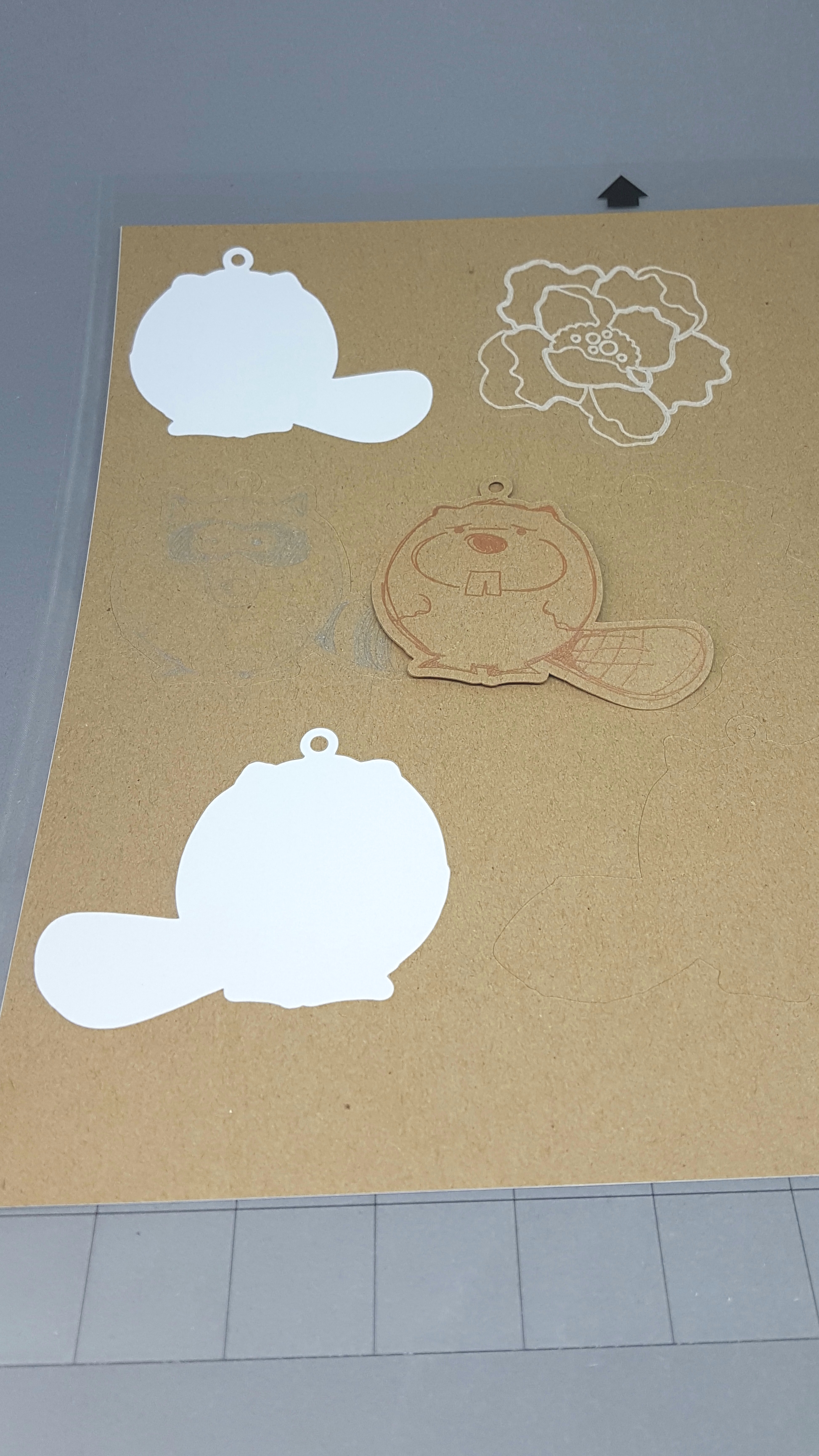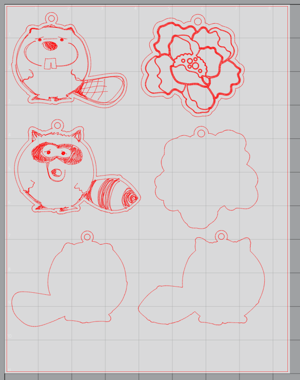 Ich habe mich für zwei Tierchen und eine Blume entschieden. Diese habe ich mir auf der Schneidmatte arrangiert. Da ich sie als Anhänger verwenden wollte, habe ich noch ein Loch, sowie ein Offset hinzu gefügt. Zusätzlich habe ich noch "leere" Formen gespiegelt und ohne Skizze drin auf den Arbeitsbereich gelegt. Du siehst später wieso...