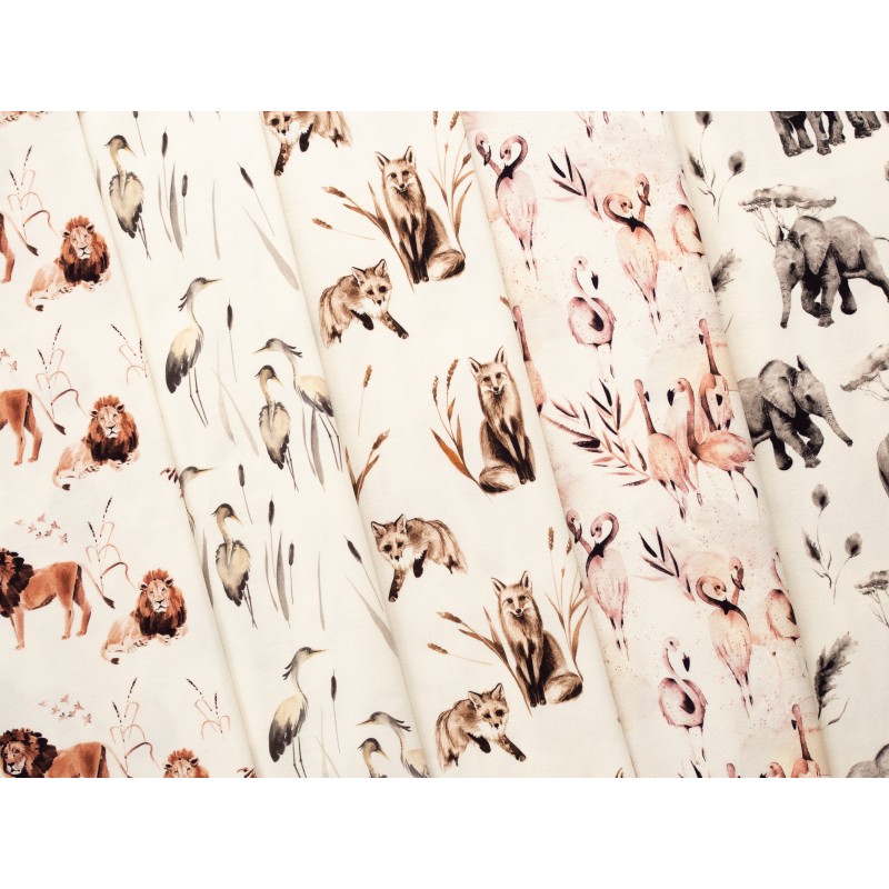 Wir gehen auf Stoff-Safari! Seinen Namen bekam Jersey Mali durch die schönen Tierdesigns. Mali befindet sich mitten in Westafrika. Die afrikanischen Savannen sind die Heimat von zahlreichen Tierarten. Auf Jersey Mali gibt es Löwen, Reiher, Füchse, Flamingos und Elefanten zu entdecken. Wir lieben die schönen, nicht zu überladenen Designs in den tollen, erdigen Tönen.