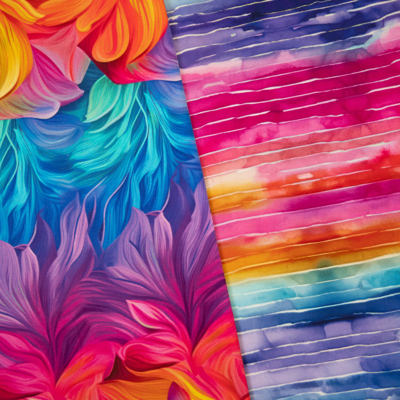 Silas ist ein moderner Baumwolljersey mit ausdrucksstarken Designs, die sofort ins Auge fallen. Grossflächige florale Motive und lebendige Regenbogen-Farbverläufe treffen auf unregelmäßige Streifen und machen den Stoff ideal für auffällige Einzelstücke. Gerade für Leggings, Sport- und Yogabekleidung entfalten diese Designs ihre volle Wirkung – bewegungsfreudig, modern und voller Ausdruck.