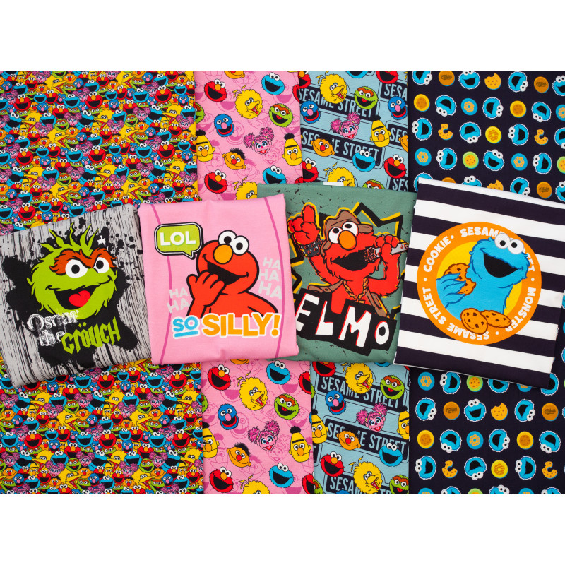 Es gibt dazu passend insgesamt vier fröhliche Allover-Designs: Die kleinen, bunten Köpfe mit den Sesamstrassenbewohnern Ernie und Bert, Elmo und Abby, Grobi, Krümelmonster, Oscar und Bibo, den rosagrundigen Jersey mit den Silhouetten der Sesamstrassen-Freunde im Hintergrund und den tollen hellblauen Stoff, bei dem die bunten Köpfe vor dem ikonischen Sesamtstrassenschild zu sehen sind. Ausserdem gibt es einen witzigen Jersey mit Krümel und seinen Cookies auf dunkelblauem Grund.