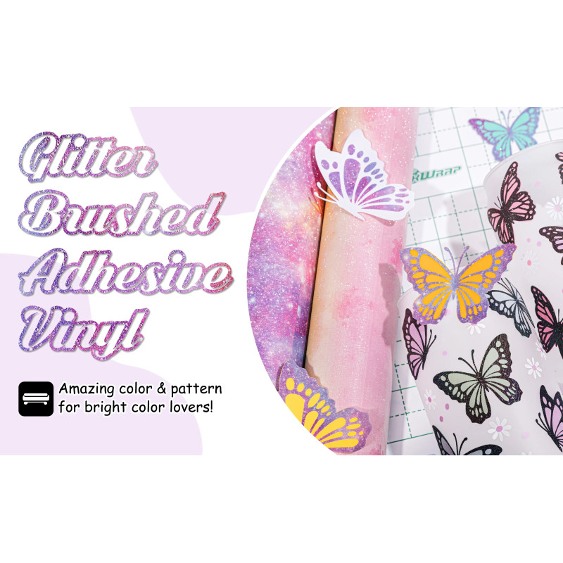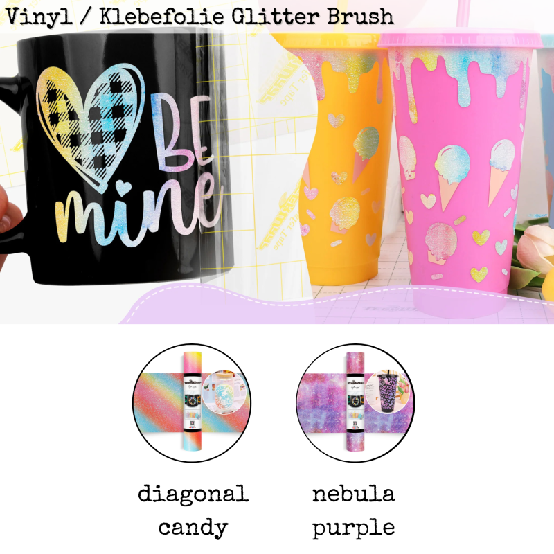 Ein Spritzer lebendige Farbtöne mit dem Funkeln von Glitzer – darum geht es bei unserem selbstklebenden Vinyl "Glitter Brush". Es ist für diejenigen, die alles Helle und Bunte lieben und überall gute Laune verbreiten möchten. Wir bieten neun verschiedene schimmernde Designs an, die deinen Projekten mit Sicherheit Leben einhauchen und es von den anderen abheben werden.