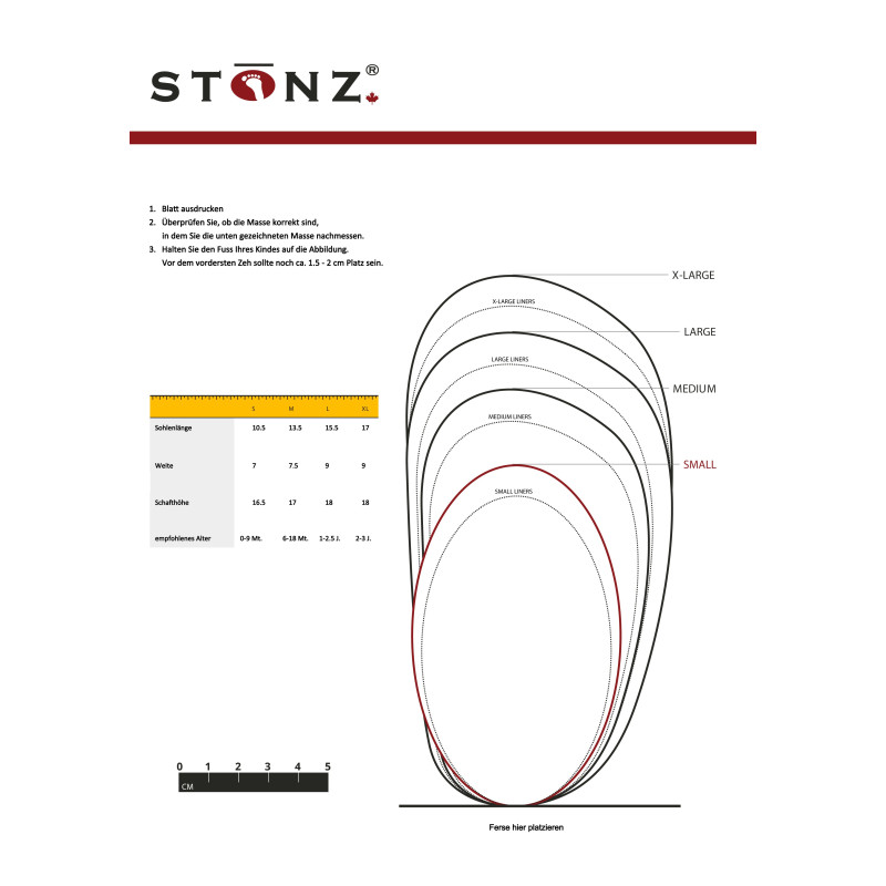 | Sohlenlänge | 10.5 cm | 13.5 cm | 15.5 cm | 17 cm |